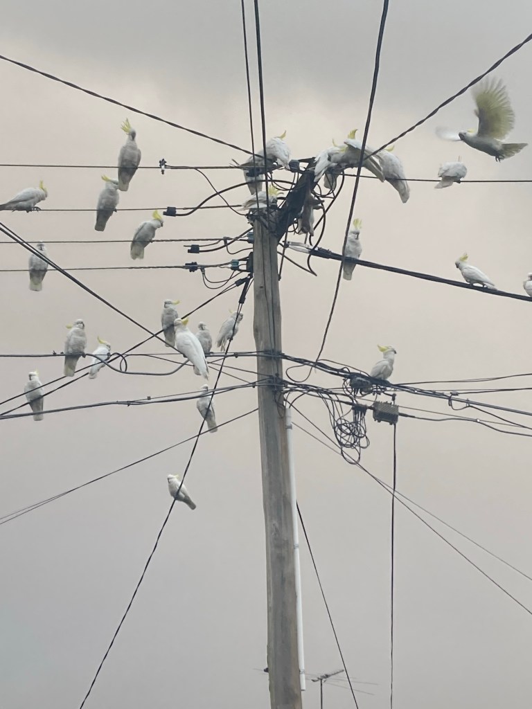 On my way to the bus stop this morning saw this huge swarm of cockatoos around this power pole. I stopped to look more closely as cockatoos clustering like so without a food source nearby is unusual for them.