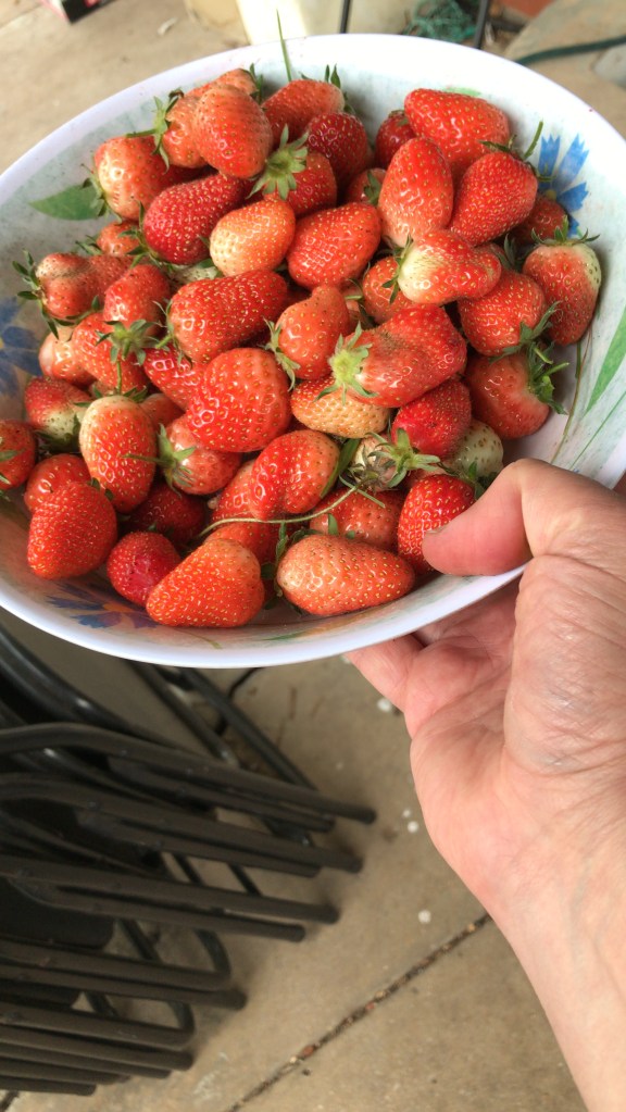 Yesterday afternoon, I picked a giant bowl of strawberries from my strawberry patch in my back yard. This is what I, in my mundane lower middle class suburban existence, see as getting back in contact with my peasant origins!